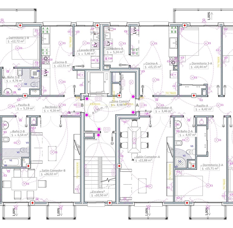 Las instalaciones son el corazón latente de cualquier edificio. Diseñamos e integramos sistemas eficientes que cumplen con las normativas más exigentes de manera armoniosa, garantizando el confort y la seguridad de los ocupantes.