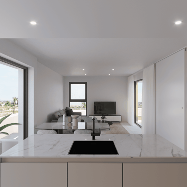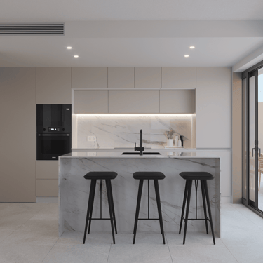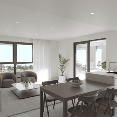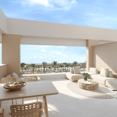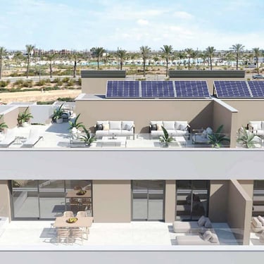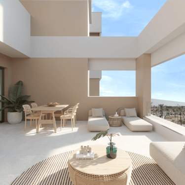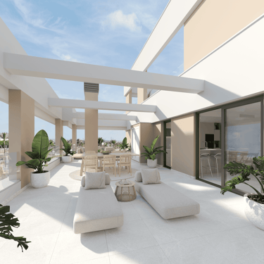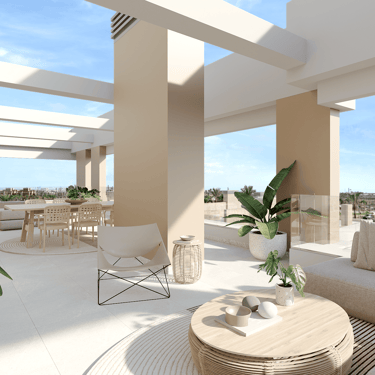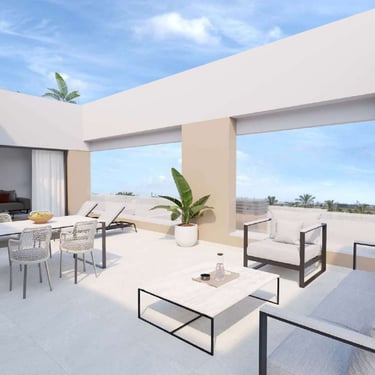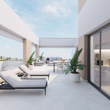 Estas joyas residenciales disponen de una terraza de 65 m² y un solárium de 86 m², espacios pensados para aprovechar al máximo el sol mediterráneo. Desde cenas al aire libre hasta momentos de desconexión con vistas inigualables, aquí cada día se disfruta como si estuvieras de vacaciones. En el interior, la calidad también marca la diferencia: climatización por conductos, suelo radiante en baños, cocina equipada con encimera de Silestone, armarios empotrados, persianas eléctricas y acabados en porcelánico de primera calidad.